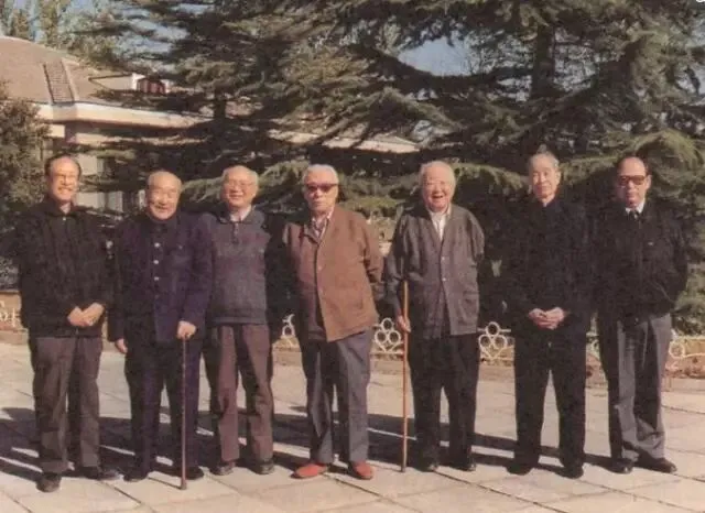 国家文物局七人鉴定组合影。自左至右:谢辰生、刘九庵、杨仁恺、谢稚柳、启功、徐邦达、傅熹年