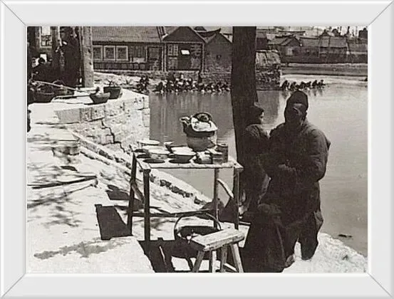 集市边卖茶水的老人,盘腿坐着,身穿长袍,一碗茶水一文钱,差不多现在五毛钱,在当时也不算便宜。 感觉行驶跟现在买矿泉水差不多。
