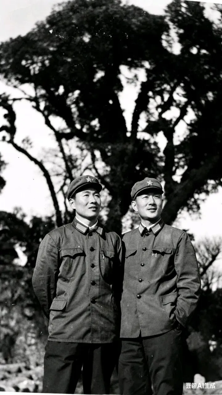 我是1983年底入伍的,一颗红星头上戴,两面红旗挂两边的六五式军服,我从入伍开始一直穿到1985年“五.一”换八五式军装。曾经穿过的这套六五式军服和戴过的帽徽、领章,我至今好好的叠放在衣柜里。今天当我再看到俩位老战友、老大哥身着六五式军服拍下的这张照片时,感到十分亲切,往昔军营中他们的音容笑貌犹在眼前。我曾经问过这张照片的拍摄者、照片中的主人翁,当年雷达三十二团保卫股常惠传股长(右)关于拍摄这张照片时的一些情况。他说:“照片背后是一棵树干很粗且枝繁叶茂的大树,大树的后面就是茂密的原始森林。当时我把照相机摆放好后,按下延时快门就站到了你们姜俊山指导员的旁边拍下了这张合影照片”。照片中只见他们两个一位双手背在身后,一位手插在裤袋里,表情神态自然、面带微笑,展现出那个年代军人特有的英气与从容。五十多年后再看这张照片,这不仅是个人的青春留影,更是一个时代的缩影,这张老照片承载着无数军人的军旅情怀与时代记忆。这张跨越近半个世纪的黑白影像,像一枚被时光打磨的勋章,静静沉淀着岁月的重量。而令我十分感慨的是不仅六五式军装早已退出军营、退出历史舞台。当年我们曾经战斗、生活过的空军雷达兵三十二团也早已撤编,据近年来回过老部队的战友说:我们的老团部、团机关的大楼和营房坍塌了很多,原来机关楼前的操场,在雨季里会存满积水。照片中这俩位身着六五式军服的老领导、老战友他们并肩而立,帽檐下的眉目间透着军人特有的坚毅,他俩身后苍劲的树木虬枝舒展,恰如他们在战火中扎根深结的战友情谊。