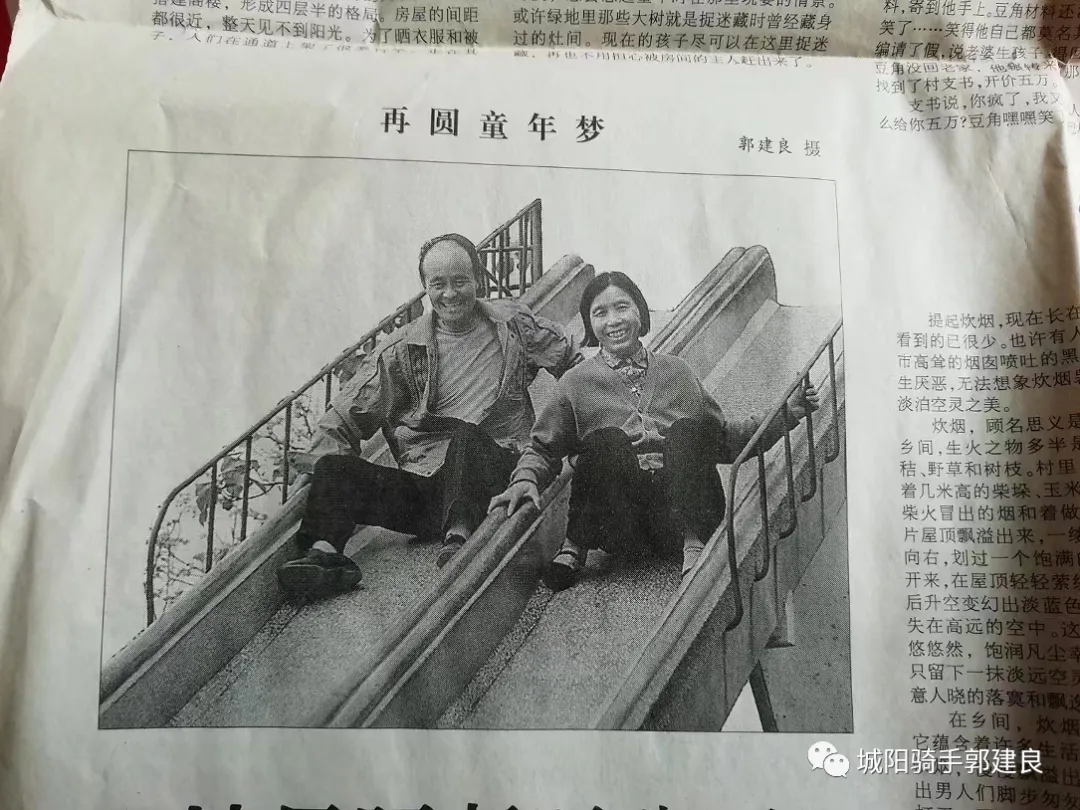 鲐背之年的父母在30年前滑过的那个滑梯下合影。郭建良摄影 2023.08.28拍摄于1993年的这幅照片,画面记录的是,花甲之年的父母像孩子一样一起滑滑梯的情景。那个滑梯在开封市非常有名,曾给一代又一代人带来无尽的快乐和美好的回忆。那一年,父亲64岁,母亲56岁。那天,父母从滑梯的高处滑下来的时候,两眼放光,笑得孩子一样开心。整理老照片的时候,没有找到相关的底片,好在还有照片。那照片上还残留着我做“二次构图”时用圆珠笔划下的剪裁线。最初,这张照片只是作为家庭生活记录保存在相册里的。后来觉得挺有生活情趣的,画面又生动,又很容易引起读者的共鸣,就在照片拍摄整整十年的时候,我把它投稿给了《中国建设报》副刊。很快,就发表在该报2003年3月21日第8版“文化周刊”上。照片的标题《再圆童年梦》是副刊编辑给改的。这一改不要紧,既偏离了社会发展的真实轨迹,也偏离了父母那代人童年的真实生活。父母年幼时,都在太行山区的豫北农村,田地与炊烟几乎就是他们生活的全部,何曾有过滑滑梯这般的“梦”可“圆”呢?如果非要以“圆梦”为主题来制作标题的话,这“圆梦”恐怕也是第一次。我想,或许该叫“终圆童年梦”更妥帖一些——一个迟到了太久太久的圆梦,以至于圆梦时刻到来的时候,主人都已经成了祖辈。古稀之年以后,父母依然喜欢逛儿童乐园,小妹郭东红就常带着他们去看孩子们滑滑梯。