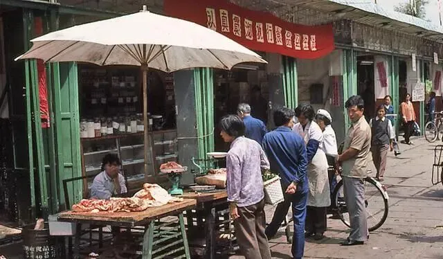 蔬菜批发市场:街边堆满了新鲜的大白菜,旁边的墙上贴着 “积极投入大会战,狠抓肉菜齐上市,一至五月” 的标语。人潮涌动,自行车穿梭。