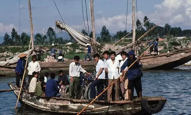 滇池渡口的渡船,一艘木船载着乘客和自行车,在滇池水面上穿行,船夫用长竹竿撑船。后面还有更大的帆船,展现了当时滇池作为交通要道的繁忙景象。