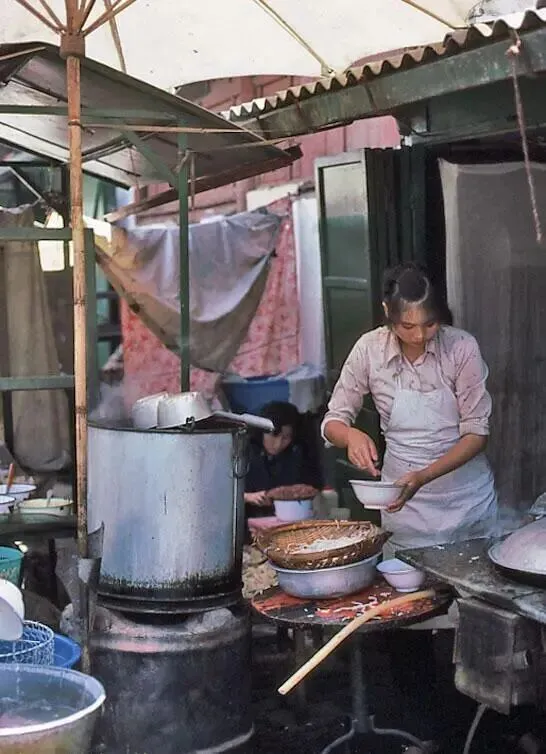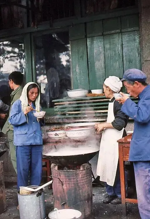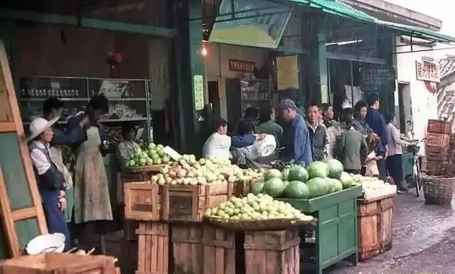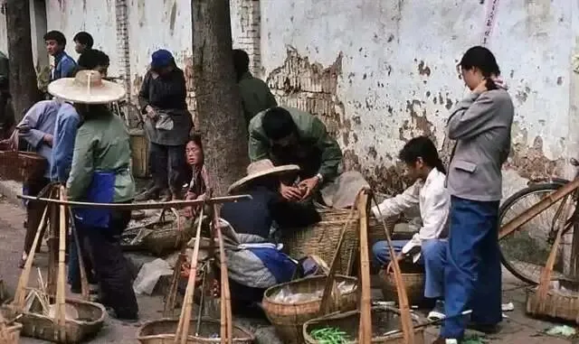 街边的菜摊:几位戴着斗笠的妇女在街边摆摊,竹篮里装满了新鲜蔬菜,一位男子正蹲在地上挑选。没有使用塑料袋,人们都用竹篮或布兜购物,这种朴素的交易方式,是那个年代最真实的写照。