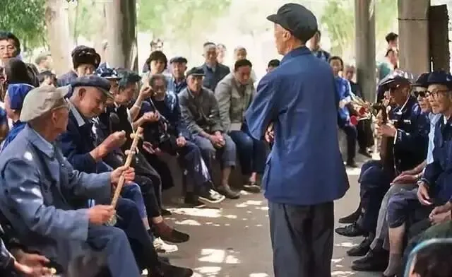 街头曲艺表演:一位老者站在人群中央,手持乐器,正在表演传统曲艺。周围坐满了穿着蓝色中山装、戴着帽子的听众,他们手持烟杆,专注聆听,这种街头娱乐是当时昆明人重要的休闲方式。