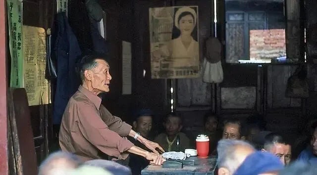 景星街文艺茶室:一位老者正站在桌前,声情并茂地说书,周围坐满了听众。墙上贴着电影海报,这种 “听书” 的休闲方式,是老昆明人重要的精神生活。