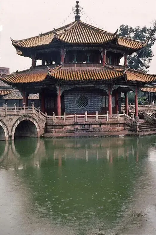 昆明翠湖公园八角亭:这是昆明翠湖公园的八角亭,尖顶,朱红立柱,倒映在碧绿的湖水中。