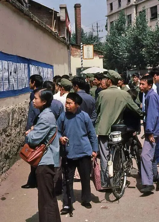 照片中,一面红色的宣传墙前,挤满了围观的市民,墙上的海报和图片,传递着当时的政策和社会动态。