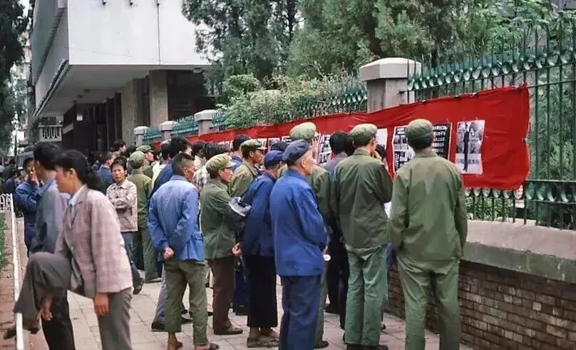 围观公告栏的人群,一面墙上贴满了公告,市民们围在旁边仔细阅读。在那个年代里,公告栏是人们获取重要信息的主要渠道。