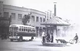 潍坊第一辆公交车,图中的二层楼是当时的百货大楼,和今天的百大在同样的位置。
