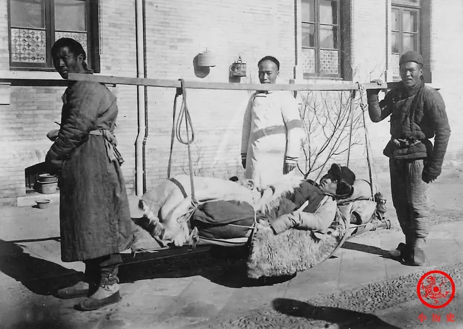 1906年,协和医学堂开学招生,专门培养中国学生,研究西医医理。同时,该校附设医院,学生可在此临床实习,自行为病人诊疗治病。照片中担架上的男子,就是被抬到协和医学堂的附属医院诊治。