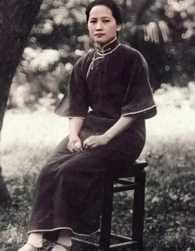 宋庆龄女士年轻时容貌秀丽,气质非凡。照片中的她身穿宽袖旗袍,头发整齐地挽在脑后,脚踩一双黑色小皮鞋,端坐于凳子上。她五官精致,面容姣好,仪态端庄,整体显得既优雅又大气。