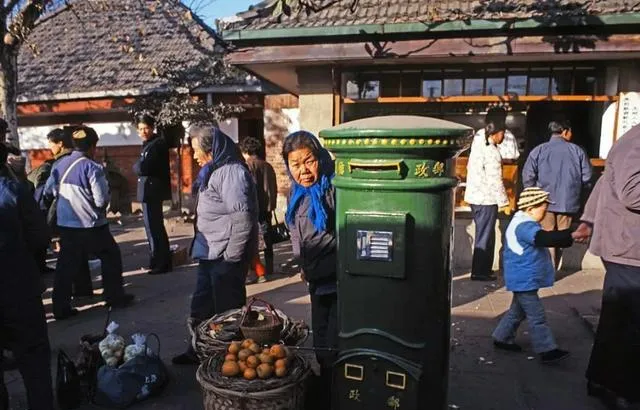 图里这个漆着墨绿色的邮筒,隔老远一眼认出来,大冬天的太阳从侧面照一半,招牌“邮政”金字还有点反光,老奶奶弯着腰准备用麻绳缠一大捆信件往里塞,旁边一筐桔子没有人看着,上海的街头老有这些绿油油直立的邮筒,小时候写信都是这么一投,盼回信得等块把月,心里装一肚子事。