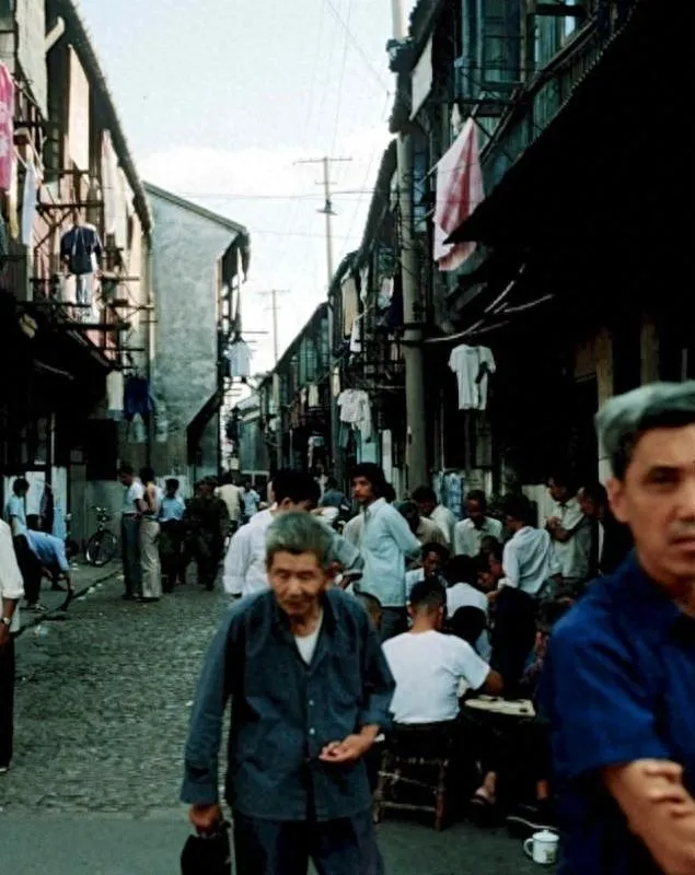 这个照片里头全是上海典型的老弄堂,窄砖路,两边楼拼得紧紧的,窗户伸出半截,晒衣杆子杵一排,随风摇着,地面扑着点水,白天黑夜,楼下声音总停不下来,左手篮子右手菜,推小车的、骑单车的、夹着报纸的叔叔,一路走过去都认识,门口坐着聊天的爷叔阿姨,嘴里不忙着嚼槟榔就是聊家常。