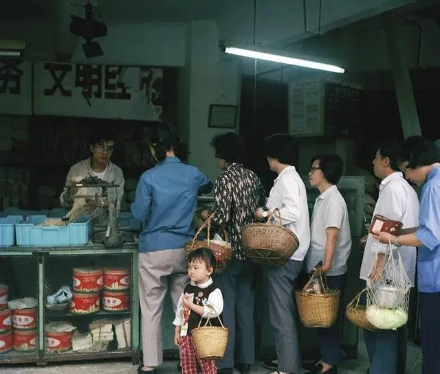 那会儿买菜还真讲究热闹,队伍拐两个弯,谁也不挤不吵,篮子里是计划票肉票米票,装的是一大家子的盘中饭,菜场天花板一根钢丝绳上还晾着备用的雨布,早上六点不到队就排起来了。