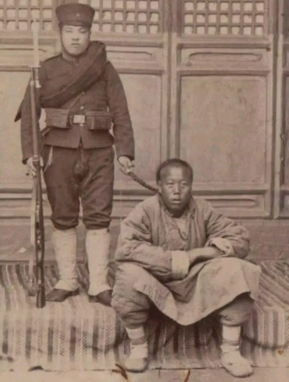中国人低着头,看不清脸,辫子被攥在手里,像攥着根绳子。