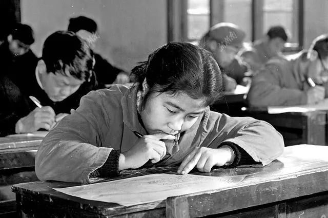图里的姑娘穿着厚旧衣裳,春秋款式,桌上横凳斑驳,手中的笔杆被咬得掉漆,神情专注,这种衣服现在都成了“复古”,当时是家家必备“正装”,外头天气还冷,谁都愿意把自己裹得结结实实去考试,现在考场里流行T恤短裤,可谁都一样想着穿得舒服些能出点好运道。