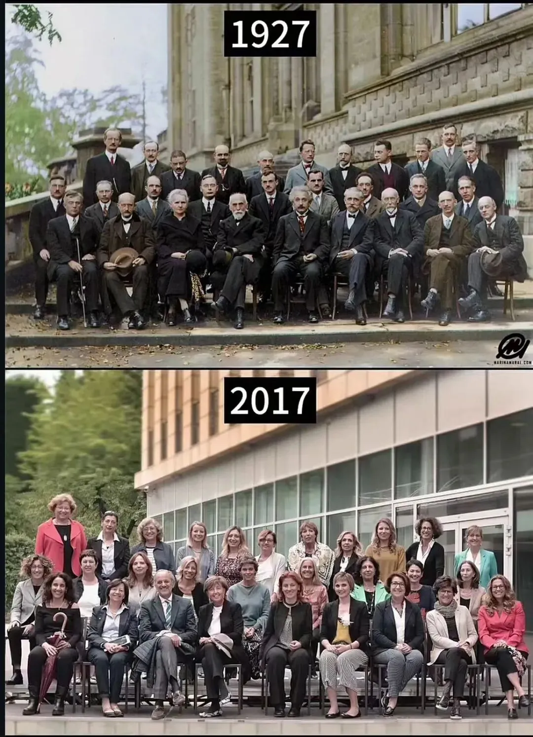 整整 90 年后,即 2017 年 9 月 14 日,角色的象征性地位发生了逆转。这张照片是在意大利物理学会于特伦托举行的一场关于女性在物理学领域作用的会议结束后拍摄的。这一次,画面中出现了 28 名女性和 1 名男性。