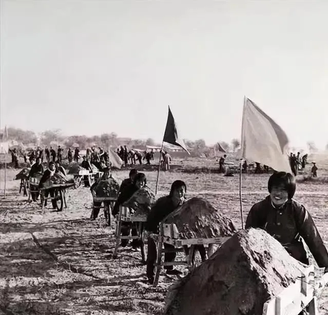 这个场面,泥地里一排排推着独轮车的男女老少,一袋袋黄泥一桶桶石子从河坝拉到岸上,红旗迎风一晃一晃,队伍长龙似的,走一趟汗就干一层,回家就是一身尘土,谁家人力多谁出工就多,母亲常说:“年轻时候就这样,庄稼人最怕下雨天耽误活”,那时候不分男女,谁手上有劲谁就跑最前头,如今这样的水利动员,早就变成机械开路,大家再难见那种起早贪黑齐心闹工的阵仗。