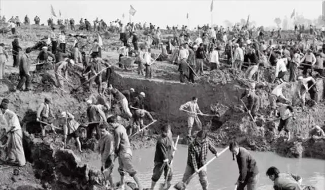这一排肩上扛着扁担和石头篓的人,不分老少,走着泥软的堤坝,石头一放连走带喘,脚下都是不规整的石块,河风一吹人却没歇下来,队里师傅喊一声:“小心别滑啦”,大家都一鼓作气,把石头一块块摞上去,水面波光里是汗水和胆气,那些年真要问啥最难,水利修堤算头一件,搁现在人可没几个愿意下这样的苦。