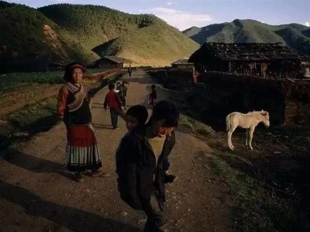 图为在农村玩耍的孩子们,一个小女孩背着自己的弟弟。