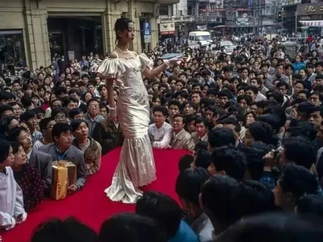 图为在农村下地干活的村妇。村妇头上的头巾在当时很流行,颜色也很多。图为大街上人们围在一起看模特表演,这在当时是很潮的表演。同时,新款服饰也在不断上市。图为老城区旧房子被拆,马上就要动工盖新楼,一位老太太在寻找有用的东西。图为建筑工人坐在铁架上休息,他在俯瞰整个城市的高楼大厦。图为在乡下,老太太在做手工艺,后面的老头是她的老伴。图为在打台球的人们。这个时候,这种新式的台球已经普及,人们休闲的时候都喜欢打两盘。图为新娘坐在拉风的跑车里,后面还放了两个毛绒米老鼠,这是这个时代最具幸福感的代表。90年代,女性穿着开始时髦起来,图中的这种打扮很时尚。一个穿红色裙子的站在路边吃早餐,不过亮眼的是后面老人。图中的一位女子开着一辆红色桑塔纳轿车,在上个世纪九十年代中国普通家庭简直是不敢想象的。这正是“中国第一村”华西村的村民,那时的华西村几乎家家都有自己的轿车,那是一般城市家庭最主要的交通工具还是自行车,拥有摩托车的都非常少,而华西村却已经每户家庭都有汽车了,经济条件比城里大部分的人还好。