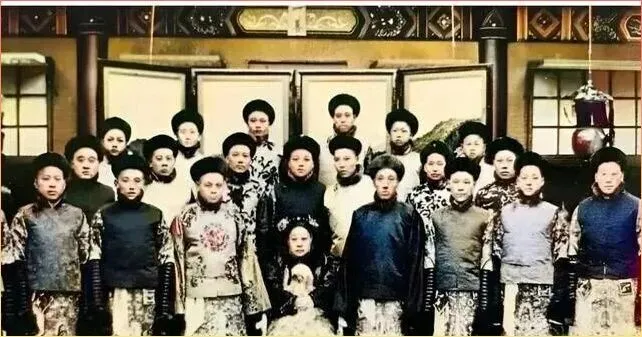 这.张全家福应该是某.位王公贵族家的.,瞧那.整齐的队列,.华贵.的服饰,还有背景墙上精致的装饰。最中间坐着的应该是家族里.最有地位的人物.,其.他人按辈分和身份依次排列,这规矩在当时可是一点都马虎不得。