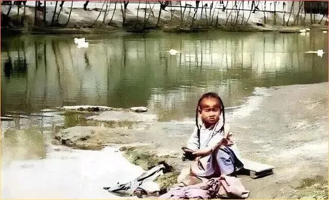 一个穿着传统.服饰的小姑娘,坐在.水.边若有所思。她的小辫子梳得.整整.齐齐,衣服虽然.简朴但很干净。这样安静.的画面,让人不禁想象她在想些什么,是在等.谁吗.?