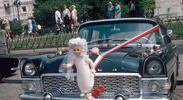 图里装饰得珠光宝气的大汽车,前杠还扎了个人偶新娘,这在当年算是底气十足的排场了,那时候苏联街头能有这架势的不是普通人家,结婚用车得提前订,家里谁有点关系才能碰上,记得有年大姑讲:“人家结婚,给甩了两朵花在车头,敲锣打鼓从广场开到胡同口”,现在无非是婚礼随便挑车,让谁开都行,那个年代你开上一圈,左邻右舍都会指着说“这家真行”,仪式感全写在车头呢。