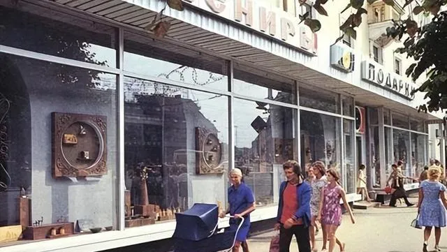 这个街头橱窗,招牌上的字母一看就是苏联味儿,玻璃里陈列着各式精致小件,门外市民拉着手推车走过,街上的光影有点浮动,气氛安稳,小时候跟着大人排队买东西,一到节假日,橱窗边总凑着人,有人抱孩子,有人推小车,左一个右一个聊着家常,“哪天能进商店不排队,才是真阔气”,这种画面你现在商场也见不到,那个下班小步慢逛的劲儿,比现在人挤人的商圈舒服多了。