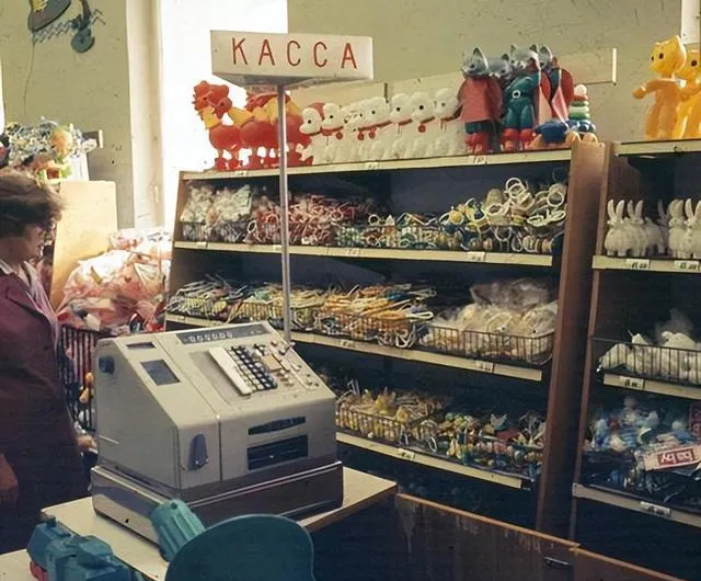 这个货架上堆满了小动物和布娃娃,是当年莫斯科老玩具店最常见的场面,收银台上的牌子还是俄文,人来人往里头转悠,小孩一进来眼珠亮晶晶地盯着货架,“买不买都想摸一下”,小时候每年过年铺子里都是新玩意,有人一边挑一边比划“这只狼是什么动画里的”,其实挑半天最后多半只买个小兔子揣在兜里,那点小心思捏得紧,幸福就藏在几块钱的小货上头,和现在大批量机械流水的玩具感觉完全不是一码事。