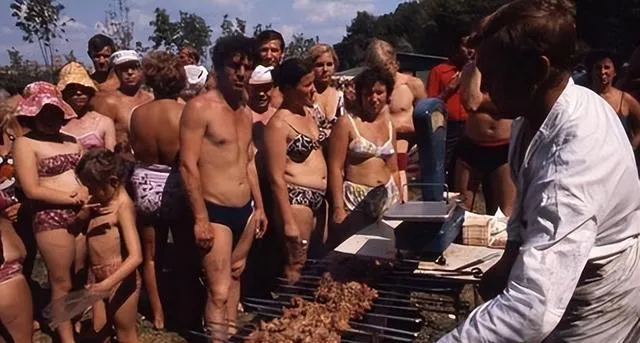 镜头切换到郊外,苏联人假期烧烤的模样放在今天依然诱人,烤串排成一溜,戴着白帽子的师傅忙得手不停,队伍里光膀子的大叔、小姑娘、小伙子站一起,大家边聊边流口水,油香顺着风跑一圈,爸爸常说,以前烧烤都得排老长时间队,轮到自家拿到串,那真是美滋滋一顿猛吃,“现在咱们自助火锅一涮全世界”,但那份野外伙食的热闹劲,现在年轻人怕是想体验也难得有那种氛围了。