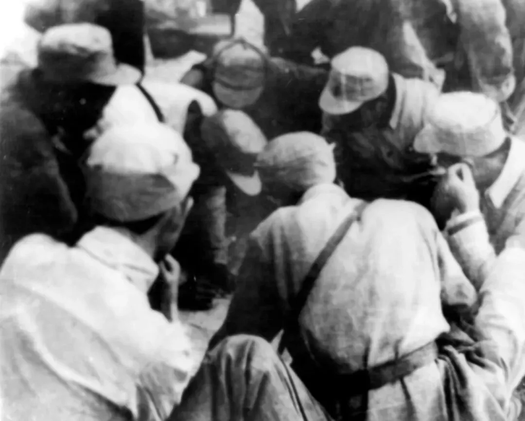1945年8月30日,胶东军区首长在平北县蟠桃区朱家井村召开西海敌工股、平北敌工科和城工科负责人会议,听取平度城内应工作计划,并布置具体任务。图为平度城解放战斗前,八路军官兵在研究讨论攻城路线。