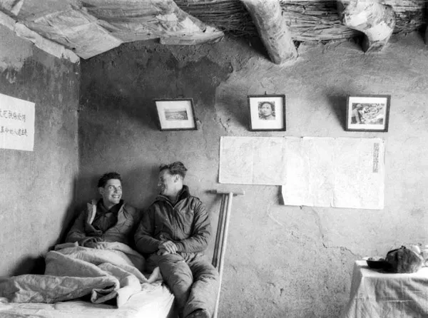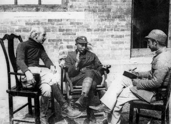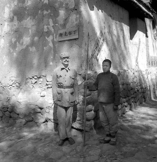 埃文思·卡尔逊(左)是第一个到延安的西方国家的军官,曾任罗斯福总统的侍卫官。他1938年两次到华北敌后考察,此行的报告及沙飞拍摄的他第一次到访晋察冀边区的部分照片,一直保存在美国罗斯福总统图书馆。这是卡尔逊1938年在河北阜平西庄村向八路军演讲。摄影:沙飞