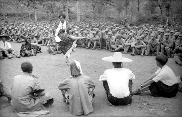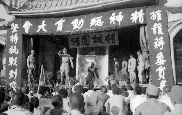 1939年7与7日,抗大二分校运动大会上,抗大二分校文工团在广场演出。沙飞/摄。
