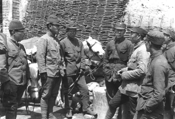 1939年5月,八路军120师359旅五台山战斗中俘敌若干名,遣返时王震旅长对日俘谈话。沙飞/摄。