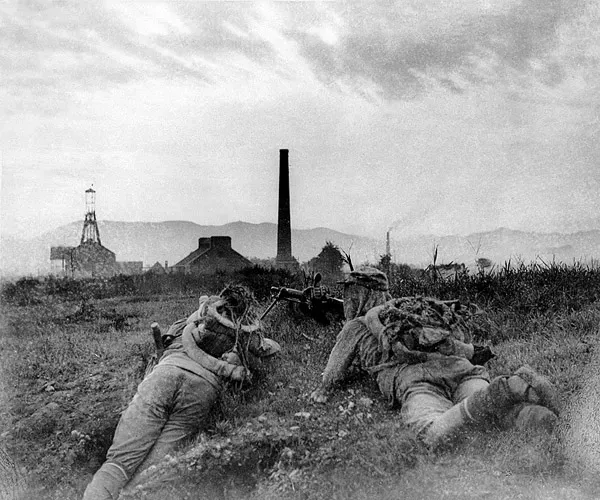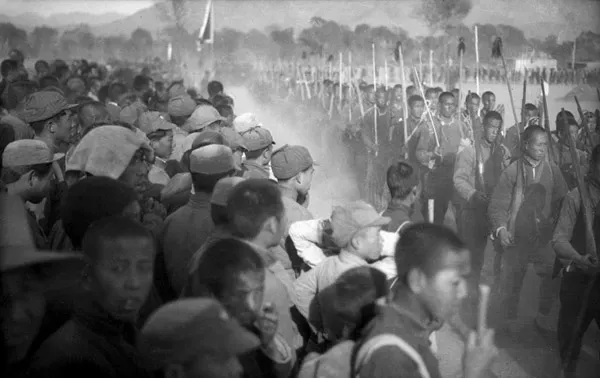 1940年8月,河北井陉县,八路军于晓雾朦胧中向井陉矿区进攻。沙飞/摄。