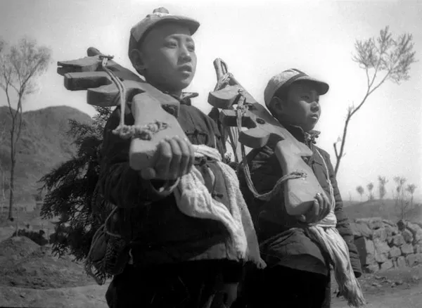 1942年2月,光荣花戴在胸,一心要当八路军。河北平山县南庄的刘梦元(左),刘汉兴(中)参军。沙飞/摄。