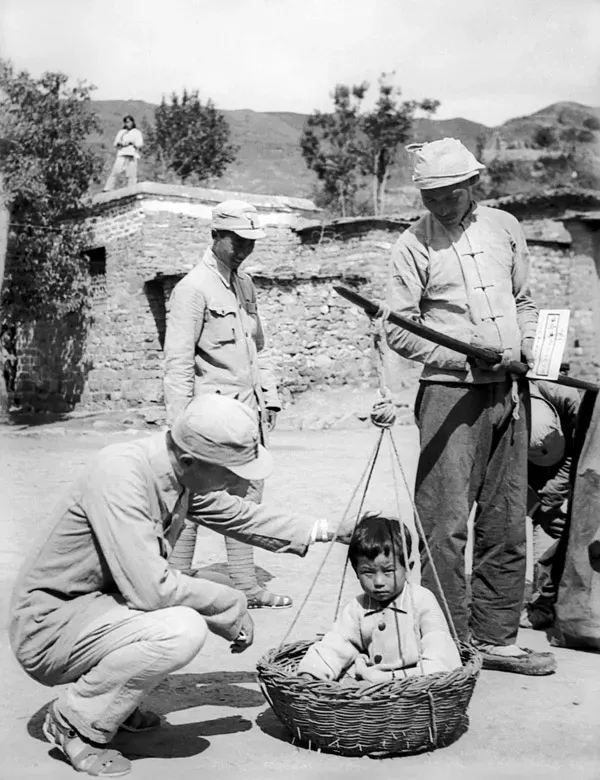 1940年8月,八路军百团大战救出的日本小姑娘美惠子,聂荣臻照顾了她,这是聂荣臻送别小姑娘。沙飞/摄。