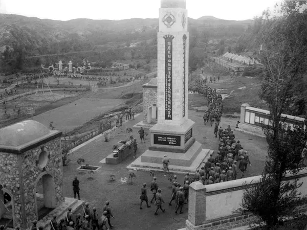 1940年,河北唐县,晋察冀边区抗战阵亡烈士纪念塔落成,在揭幕典礼上,八路军将士列队祭奠凭吊。沙飞/摄。