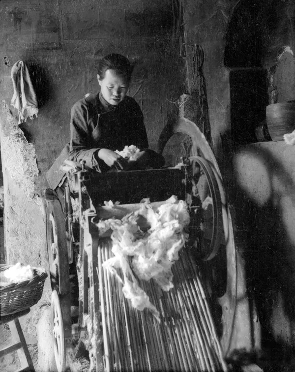 1940年,河北平山县某村,轧棉花。沙飞/摄。