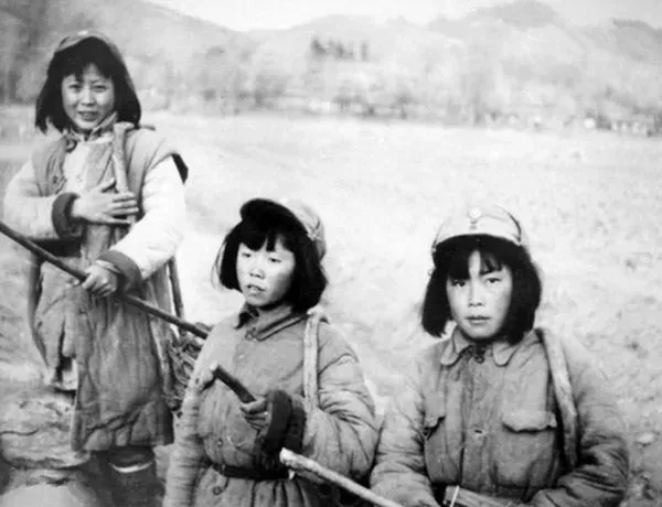 1941年初,河北阜平县沙河畔,八路军女战士在大生产中积肥。左起严金萱、贾惠芬、贾素娥。沙飞/摄。