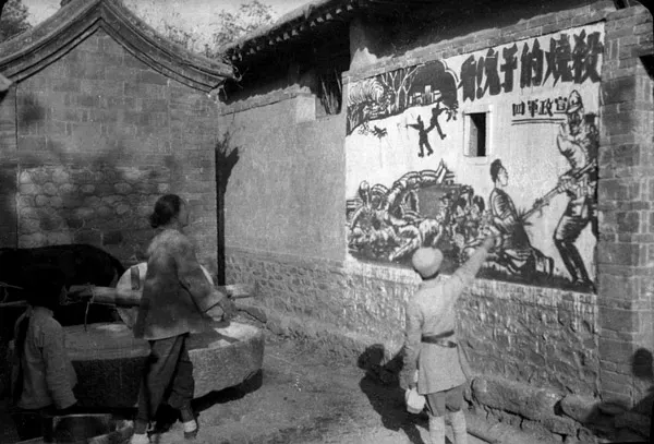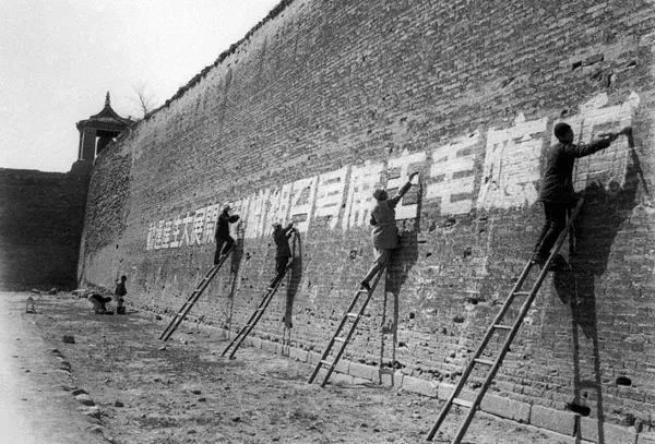 1945年,河北省灵丘,人们正在城墙上刷写政治标语。沙飞/摄。