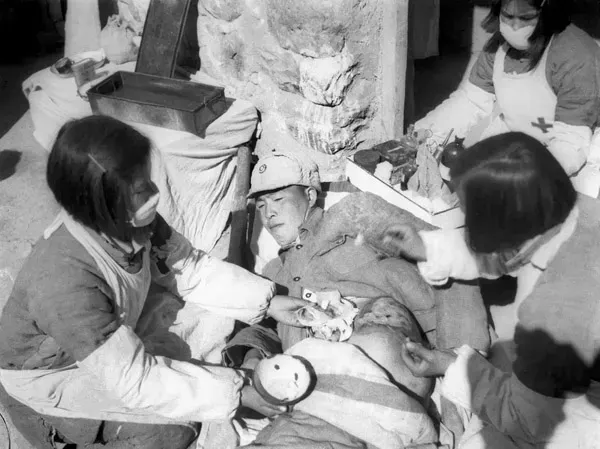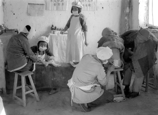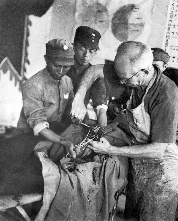 1944年,河北省唐县白求恩国际和平医院,给伤病员换药。沙飞/摄。