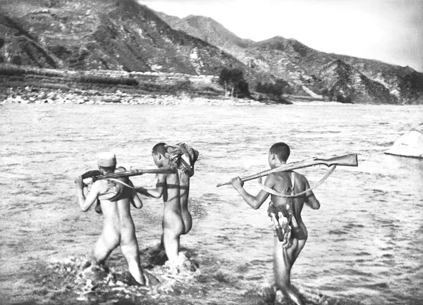1939,平西挺进军游击队偷渡拒马河,袭击紫荆关敌据点,开辟冀西抗日根据地。沙飞/摄。