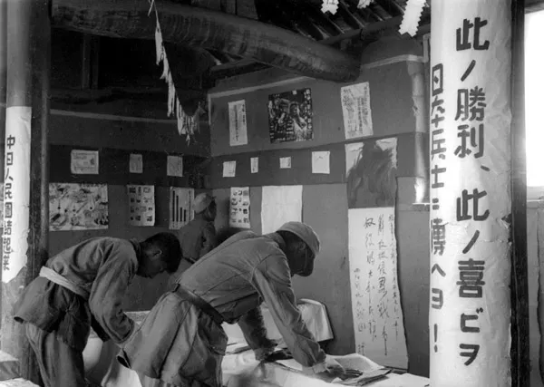 1942年,反战同盟晋察冀支部成立周年纪念大会上之反战宣传品展览室。沙飞/摄。