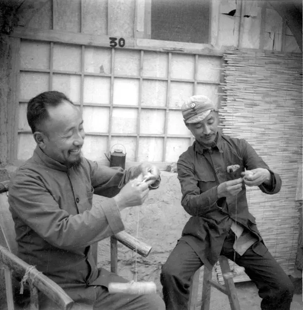 1942年,晋察冀边区参议会副议长于力(左)、高等法院院长王斐然捻毛线。沙飞/摄。