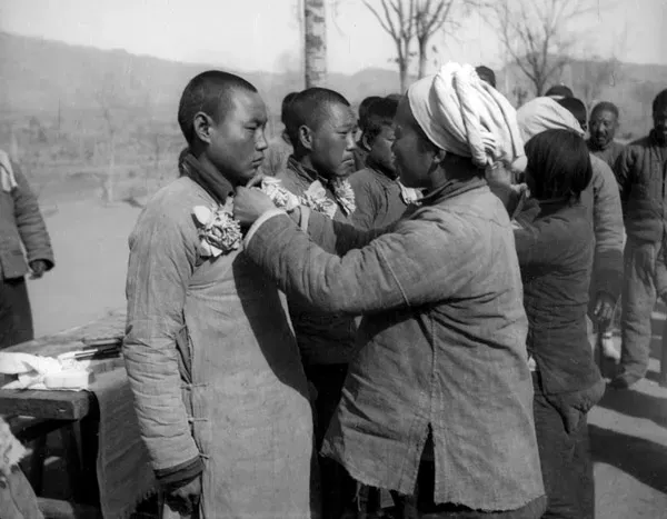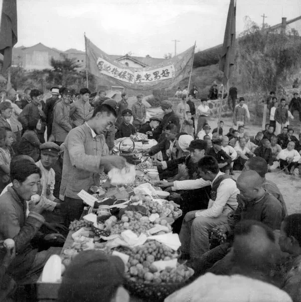 1939年6月, 河北阜平一区参军大会上给参军青年家属发馒头。沙飞/摄。
