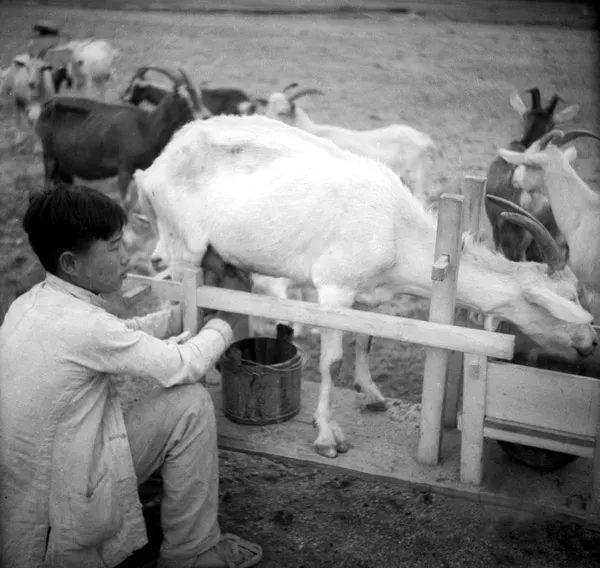 1944年,晋察冀边区政府工作人员挤羊奶。沙飞/摄。