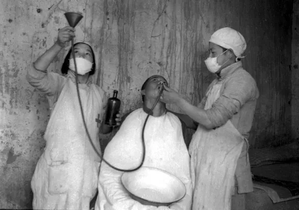 1944年,河北省唐县白求恩国际和平医院耳鼻喉科,大夫给病人洗胃。沙飞/摄。