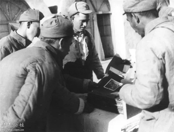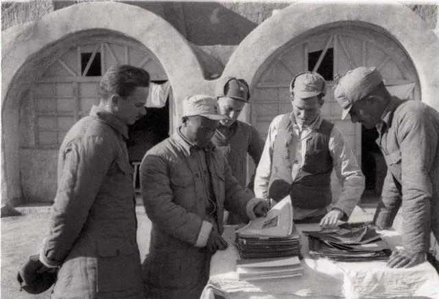 1944年,美军观察组及美飞行员看晋察冀画报社赠送的图片。